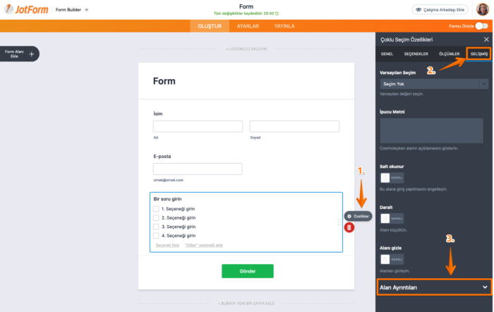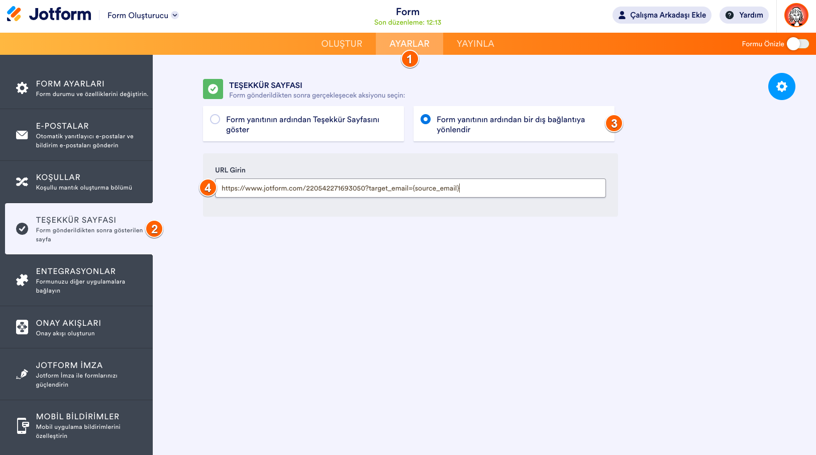 - Form Oluşturucu’da en üstteki Ayarlar’ı seçin.