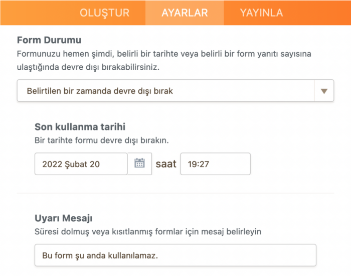 Bu seçenek, formunuzun belirtilen bir tarih ve saatte devre dışı bırakılmasına imkan sağlar.
