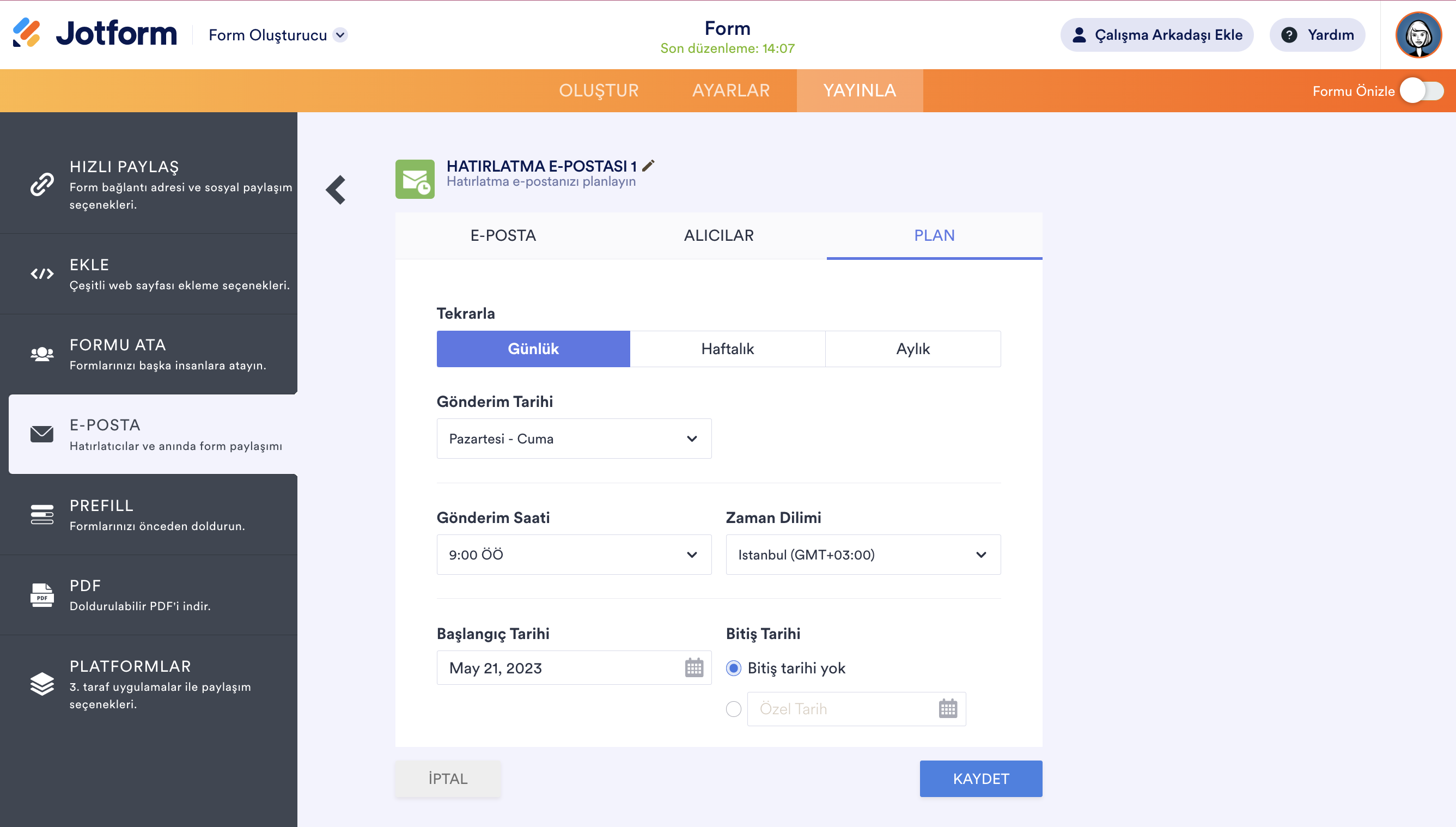 Plan sekmesi, hatırlatma e-postalarınızı ne zaman göndereceğinize dair seçenekler sunar.