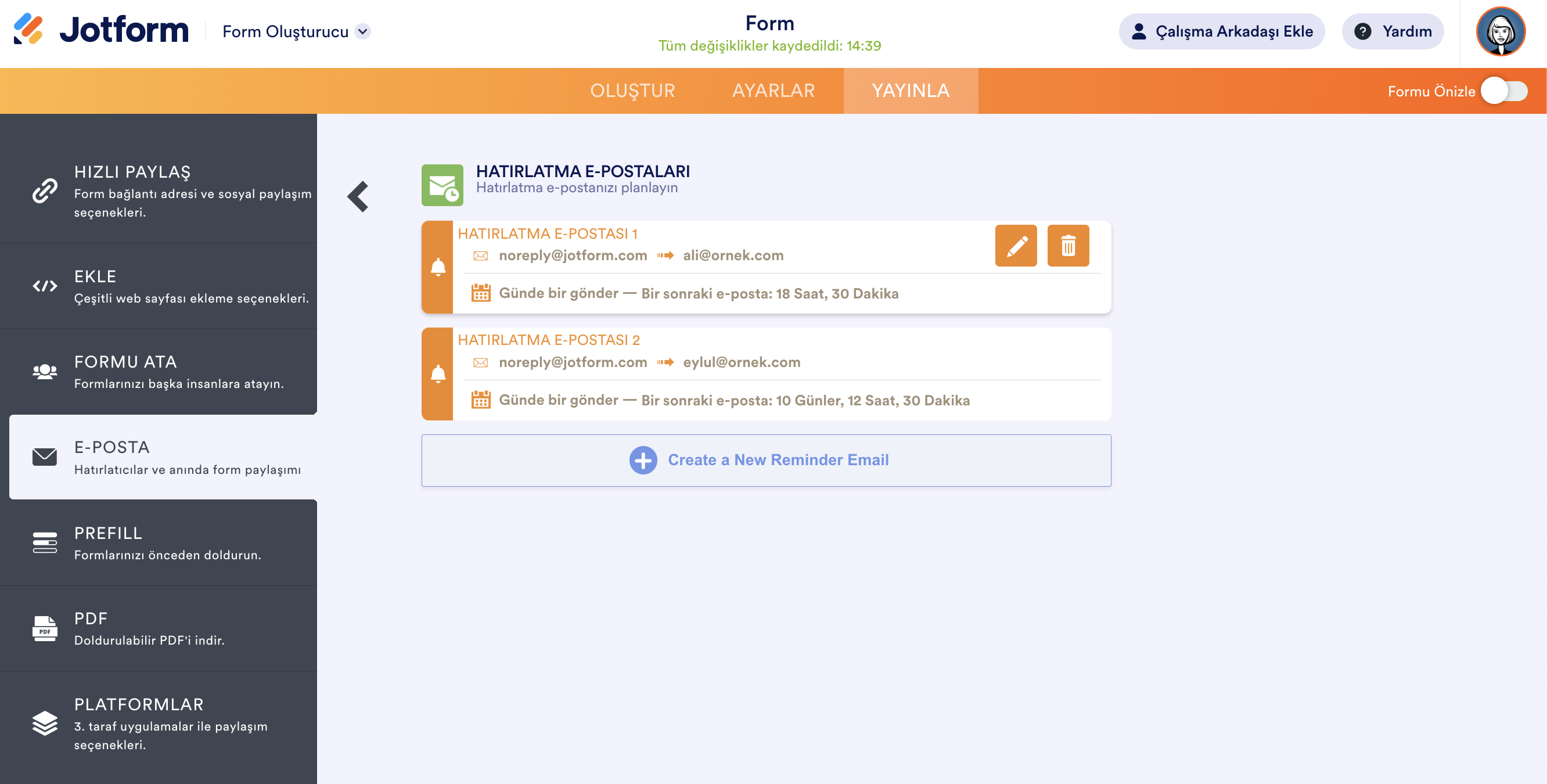 Eğer formunuz için ayarlanmış herhangi bir hatırlatma e-postası mevcutsa hatırlatma e-postalarını, zamanlama bilgilerini ve bunları oluşturma, düzenleme veya silme yollarını listeleyen bir panel sizi karşılayacaktır.