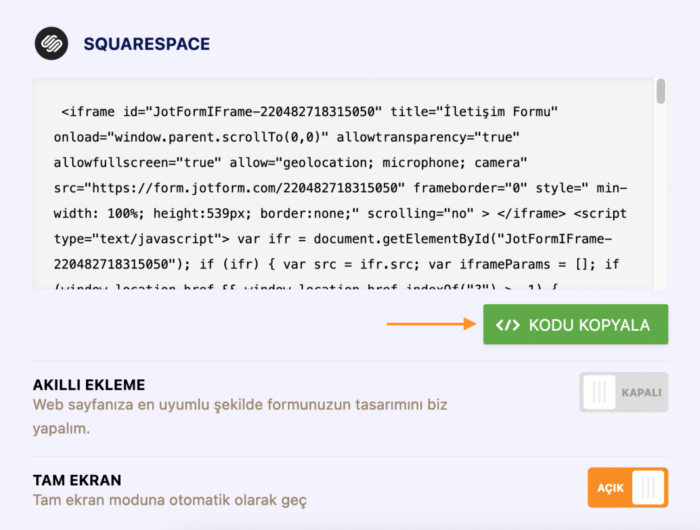 Not: Eğer yerleştirilmiş form Squarespace web sitesinde düzgün çalışmıyorsa, siteniz için Ajax yüklemesini kapatmanız gerekebilir. Daha fazla bilgi için bu adresi ziyaret edebilirsiniz.