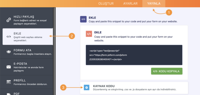 Eğer form dosyalarını kendi sunucunuzda barındırmak isterseniz, Yayınlama sihirbazından, Kaynak Kodunu İndir butonuna tıklayarak formunuzun kendi ayrı CSS ve JS dosyaları bulunan, sıkıştırılmış ve düzenlenmiş bir versiyonunu indirebilirsiniz: