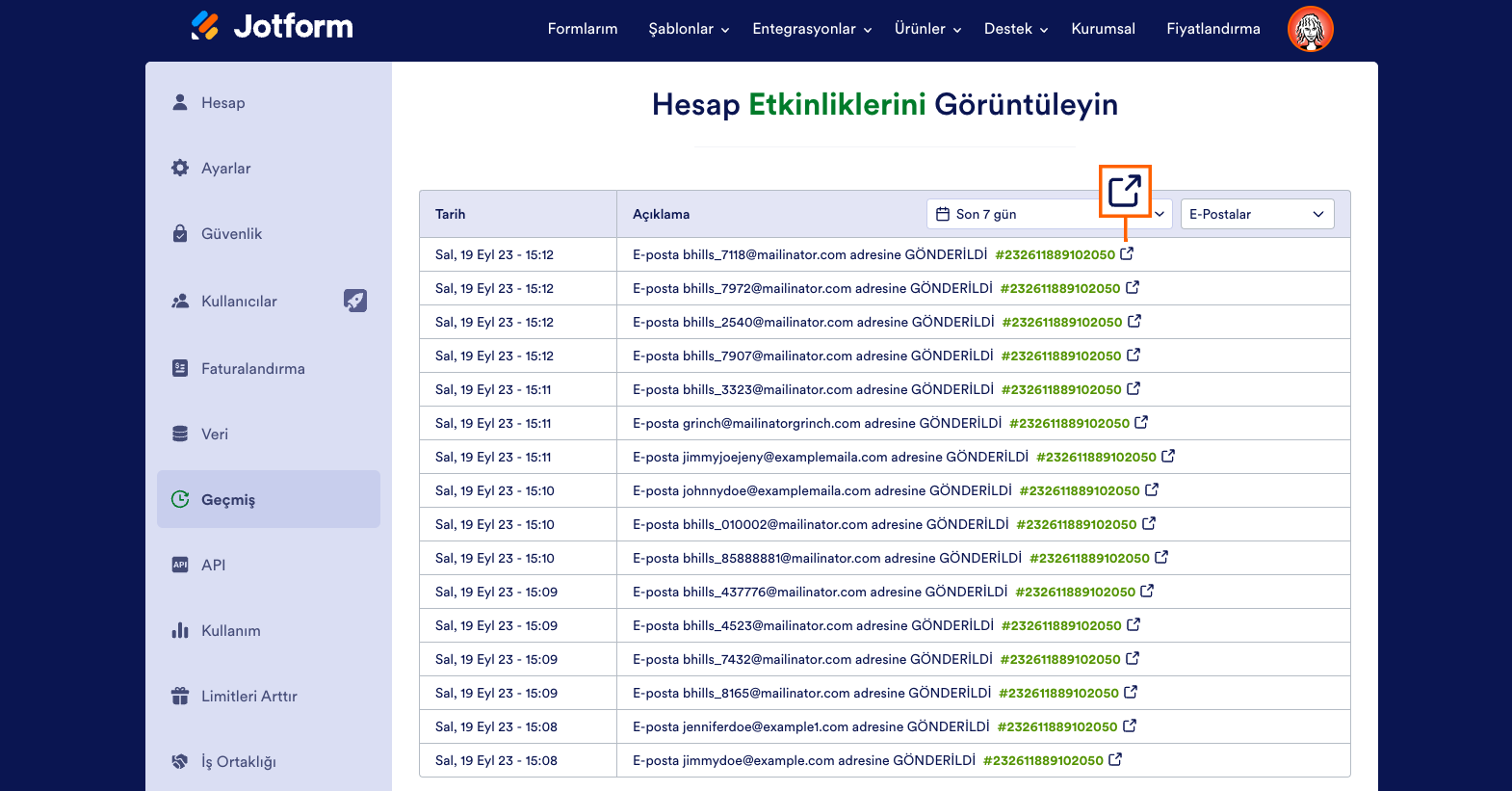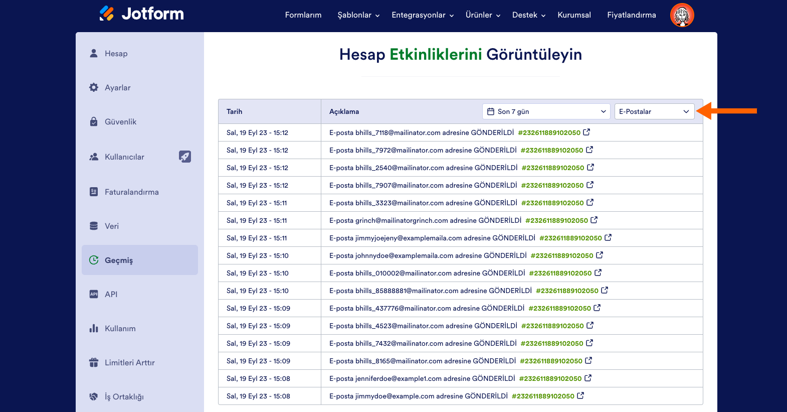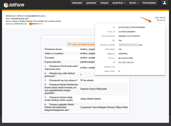 Form e-postanızın durumunu bilmek önemlidir, bu nedenle hesabınızdan bunu kontrol edebilmeniz için harika bir araç ekledik. Bu aracı kullanarak, e-postanızın alıcı e-posta adresine başarıyla gönderilip gönderilmediğini ve eğer gönderilemedi ise hangi nedenlerden gönderilmediğini öğrenebilirsiniz.