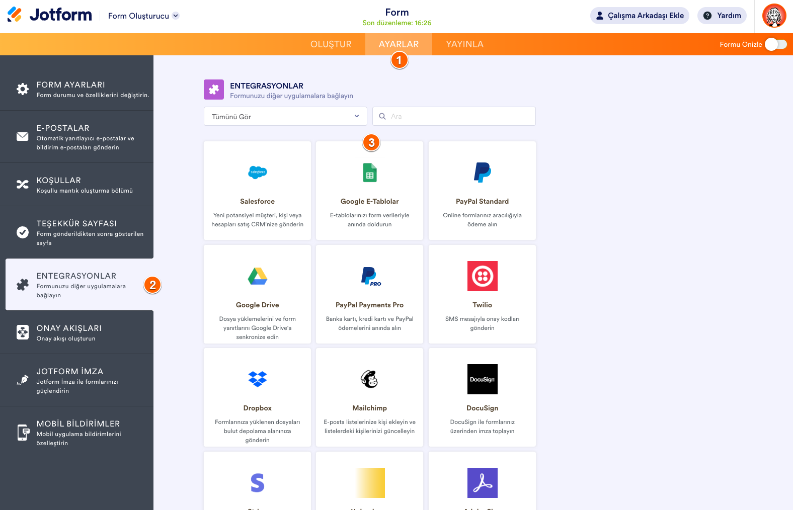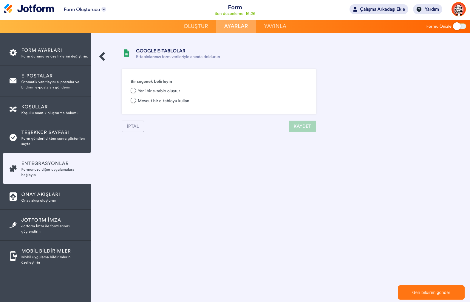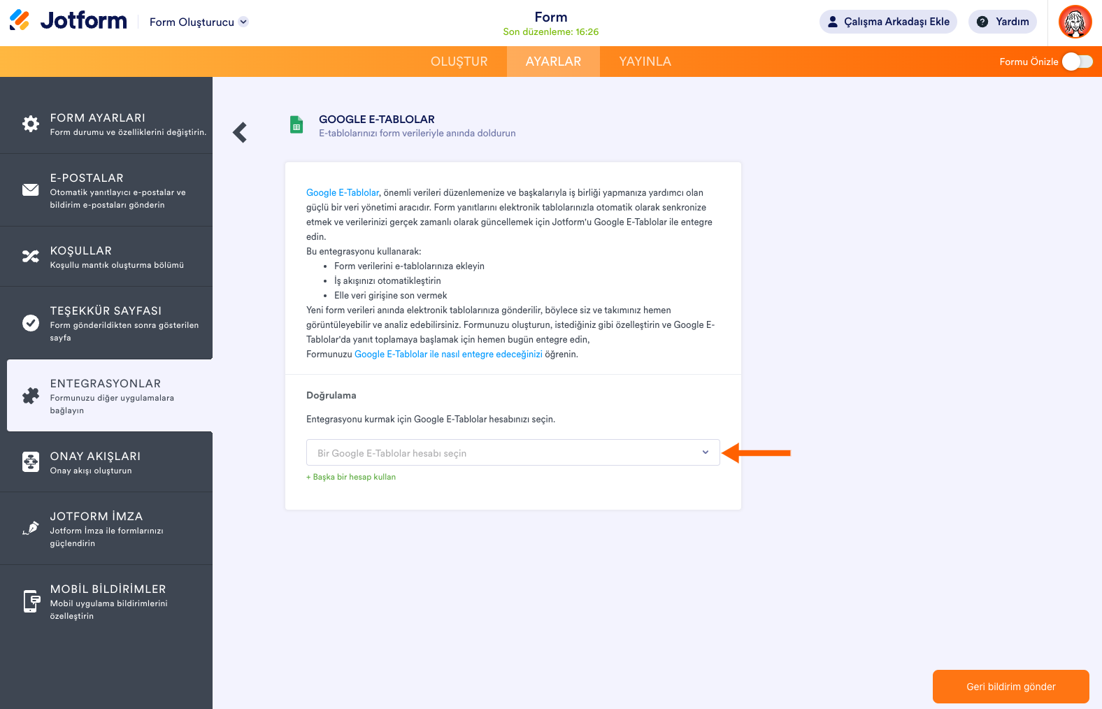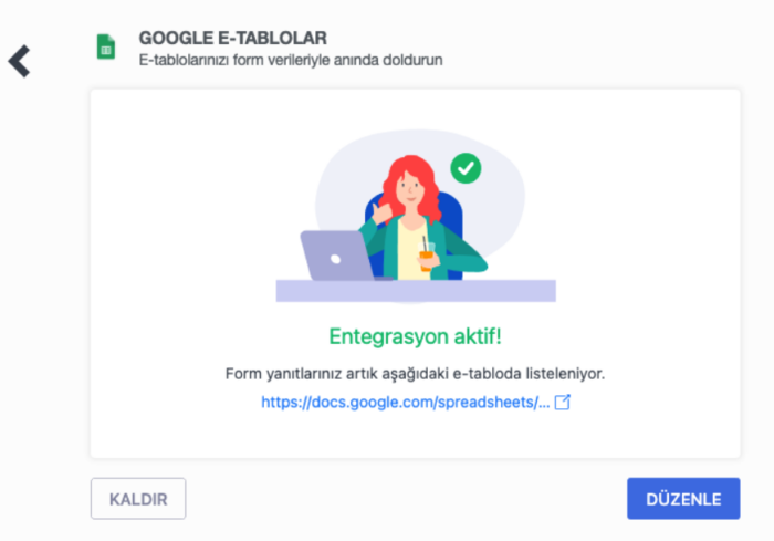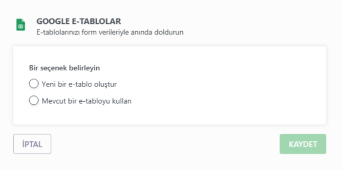 Formunuza Google E-Tablolar ile entegrasyonunu kurmak hızlı ve kolaydır. Lütfen aşağıdaki adımları takip edebilirsiniz: