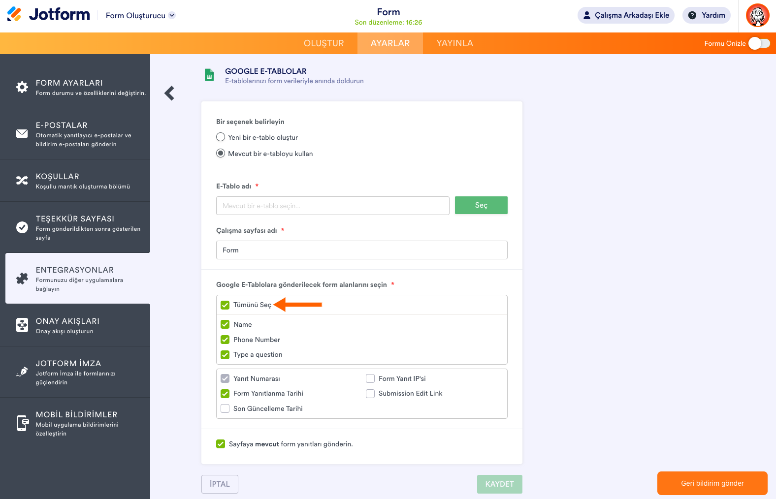 - Entegrasyondan önce mevcut form verilerinizi e-tablonuza eklemek için Sayfaya mevcut form yanıtları gönderin seçeneğini açın.