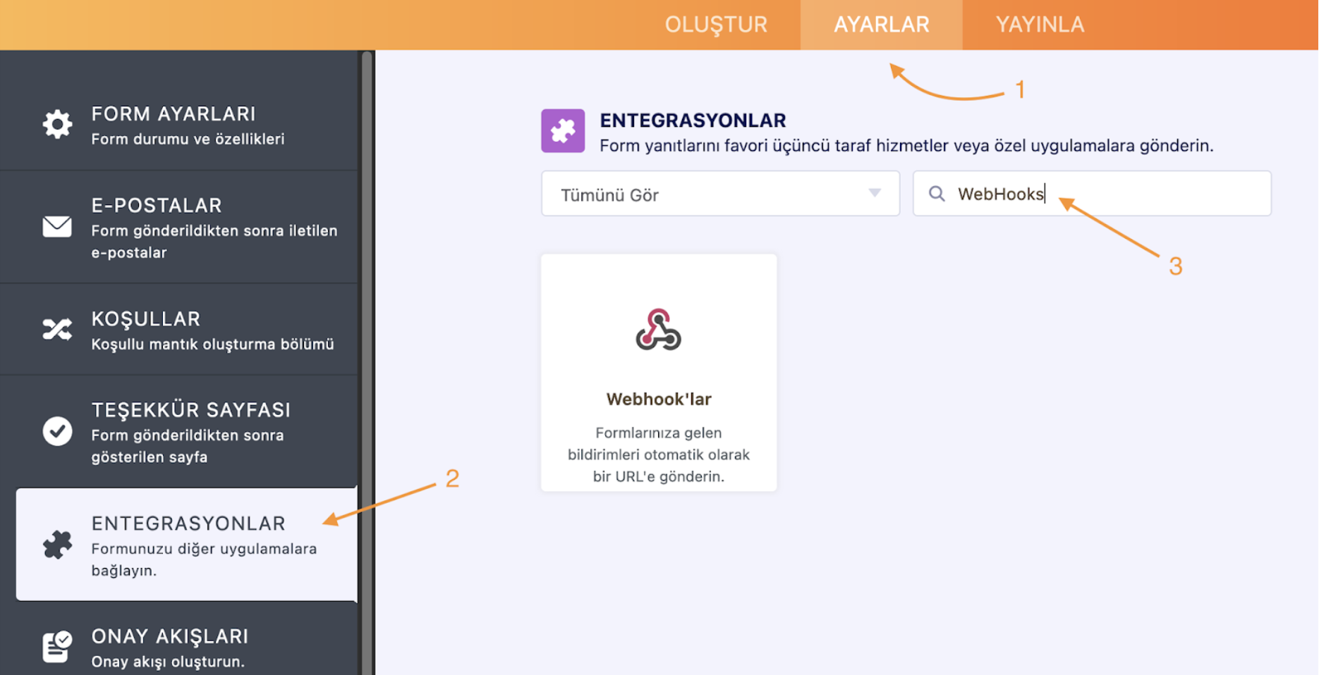 1. Formunuzu, Form Oluşturma Aracı içerisinde açın ve turuncu bar üzerinden Ayarlar’a tıklayın. Daha sonra, Entegrasyonlar bölümüne gidin ve arama kutucuğuna WebHooks yazın, veya sonucu, açılır menüden “Diğer” ile filtreleyin.