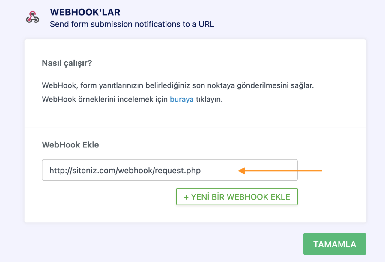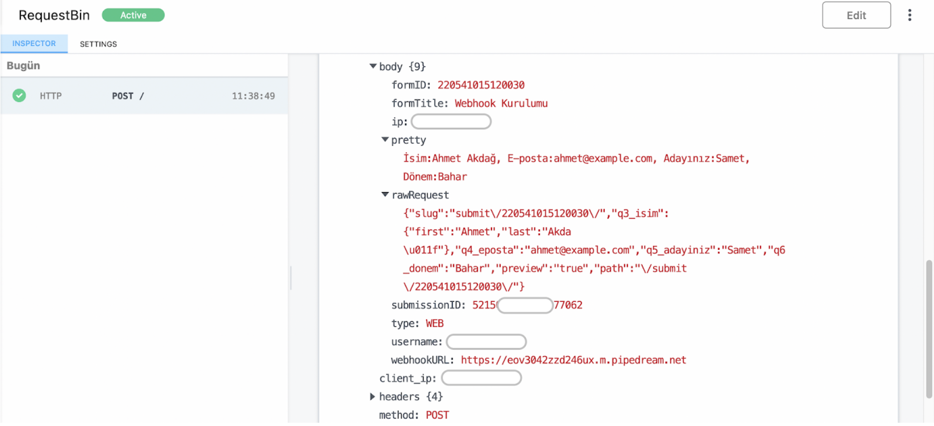 Bir webhook isteğini incelemek veya hatalarını ayıklamak için, RequestBin kullanabilirsiniz. Basitçe bir İstek Kusu oluşturun ve uç nokta URL’ini (2. adımdaki ekran görüntüsünde göründüğü gibi) formunuzun webhook’u olarak ayarlayın. Kurulumu tamamladıktan sonra, formunuza gerçek bir form yanıtı gönderin ve toplanan veriyi İstek Kutusu’ndan kontrol edin.
