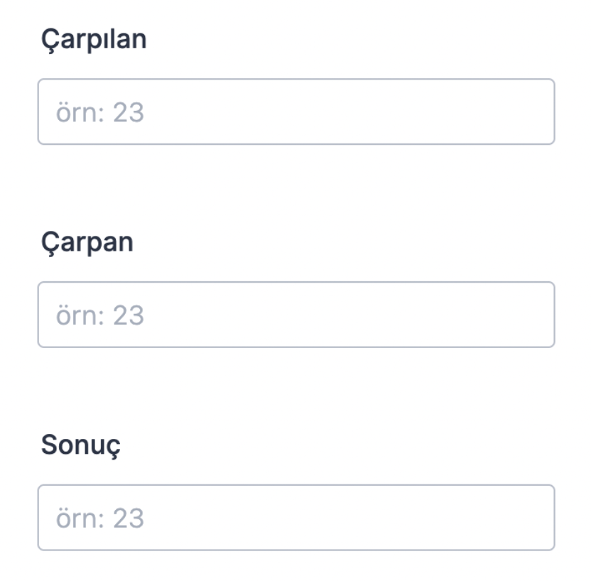 Örnek olarak, ilk iki tanesinden ortaya çıkan sonucu üçüncüsüne ekleyeceğimiz, üç adet Sayı alanından oluşan bu basit çarpma işlemi alan setini kullanıyor olacağız: