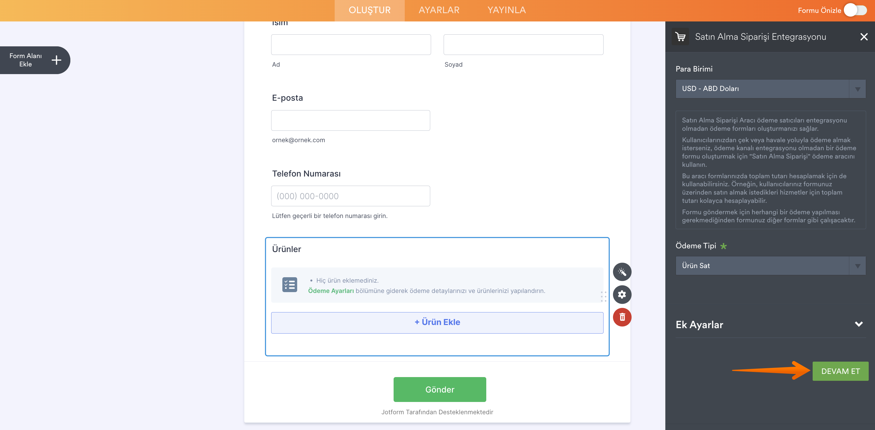 - Form Oluşturucu’da sayfanın solunda yer alan Form Alanı Ekle butonuna tıklayın.