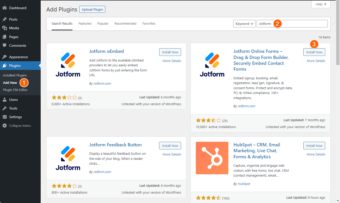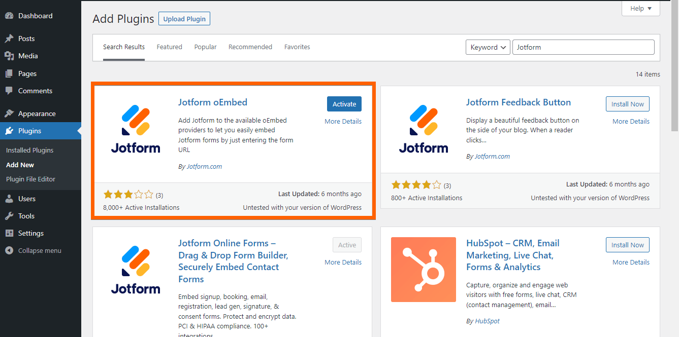 - Jotform için arama yapın. Jotform.com tarafından yazılmış üç farklı eklenti bulacaksınız. Embed Form eklentisi, Jotform Online Forms – Drag & Drop Form Builder, Securely Embed Contact Forms olarak etiketlenmiştir.