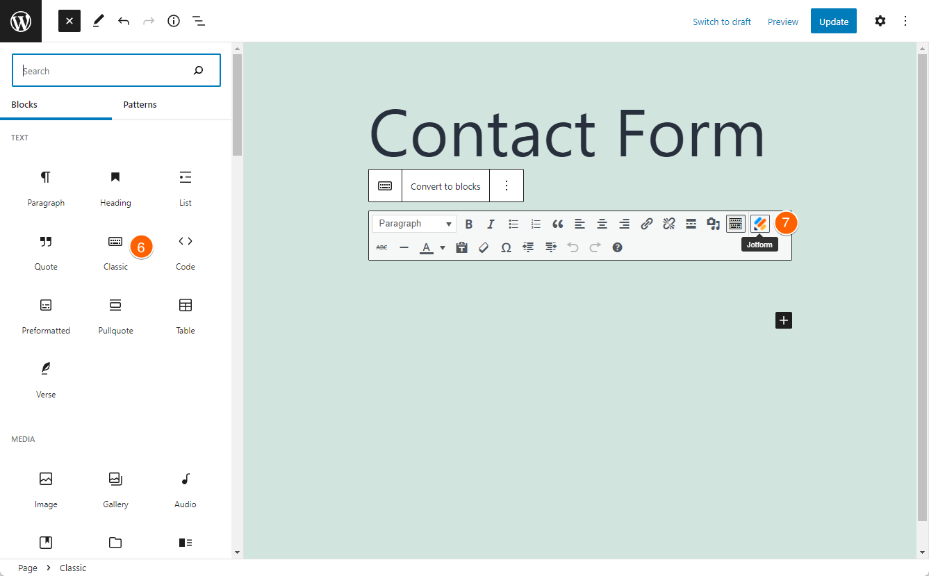 - Gutenberg editörünü kullanıyorsanız, Jotform simgesini görmek için bir Classic blok eklemeniz gerekecektir.