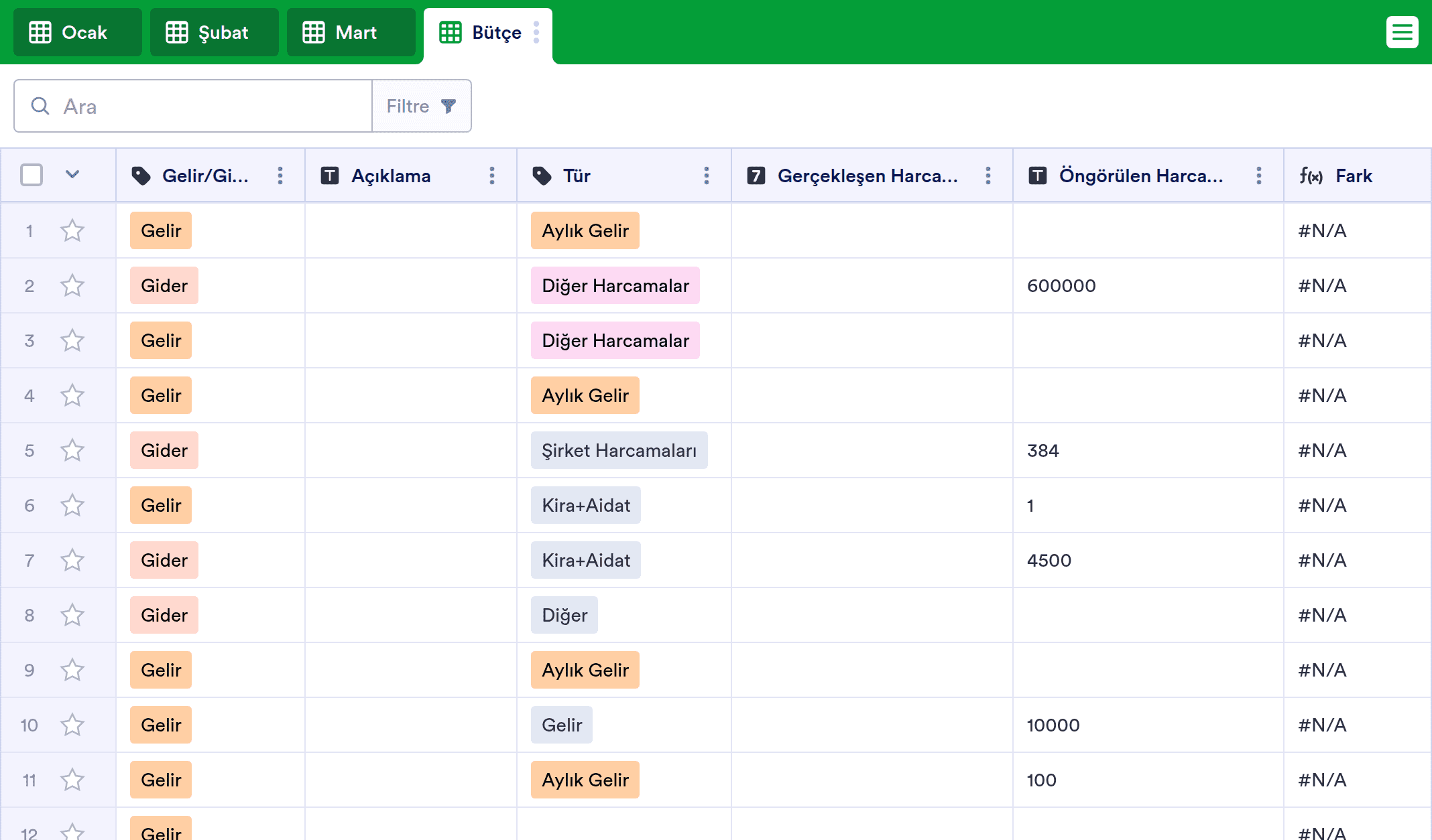 Yalnızca birkaç tıklamayla bu Aylık Bütçe Şablonunu özelleştirerek, ihtiyaçlarınızı en iyi şekilde karşılayacak hale getirebilirsiniz. Verilerinizi aylara göre düzenlemek için yeni sekmeler ekleyebilir, etiket adlarını ve renklerini değiştirebilir, ve toplam tutarları, hızlı hesaplama özelliğimiz sayesinde kolayca hesaplayabilirsiniz. Dahası, size en uygun görüntüleme biçimini bulmak için tablo, kart ve takvim görünümleri arasında değişim yapabilirsiniz! Harcamalarınızı her türlü cihaz üzerinden takip etmenize yardım eden, özelleştirilmiş bir Aylık Bütçe Şablonu ile, harcamalarınızı takip edebilir ve bütçe aşımını önleyebilirsiniz.