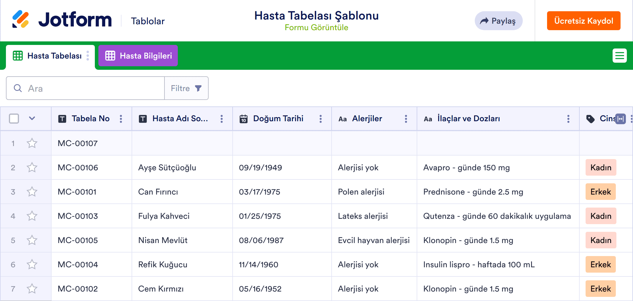 Jotform, HIPAA uyumluluğu olan bir İş Ortaklığı Sözleşmesine sahiptir. Bu sayede hastalarınızın hassas verilerini HIPAA uyumlu bir şekilde güvenle saklayabilirsiniz. Yeni satırlar, sütunlar ve sekmeler ekleyerek, etiket adlarını ve renklerini güncelleyerek ve hatta verileri diğer hesaplarınızla otomatik olarak senkronize etmek için formu 100'den fazla uygulamaya bağlayabilir ve bu Hasta Tabelası Şablonunu dilediğiniz gibi özelleştirebilirsiniz! E-tablo, takvim veya kart görünümünde bulunan Jotform'un Hasta Tabelası Şablonu ile hasta verilerini online olarak zahmetsizce yönetin.