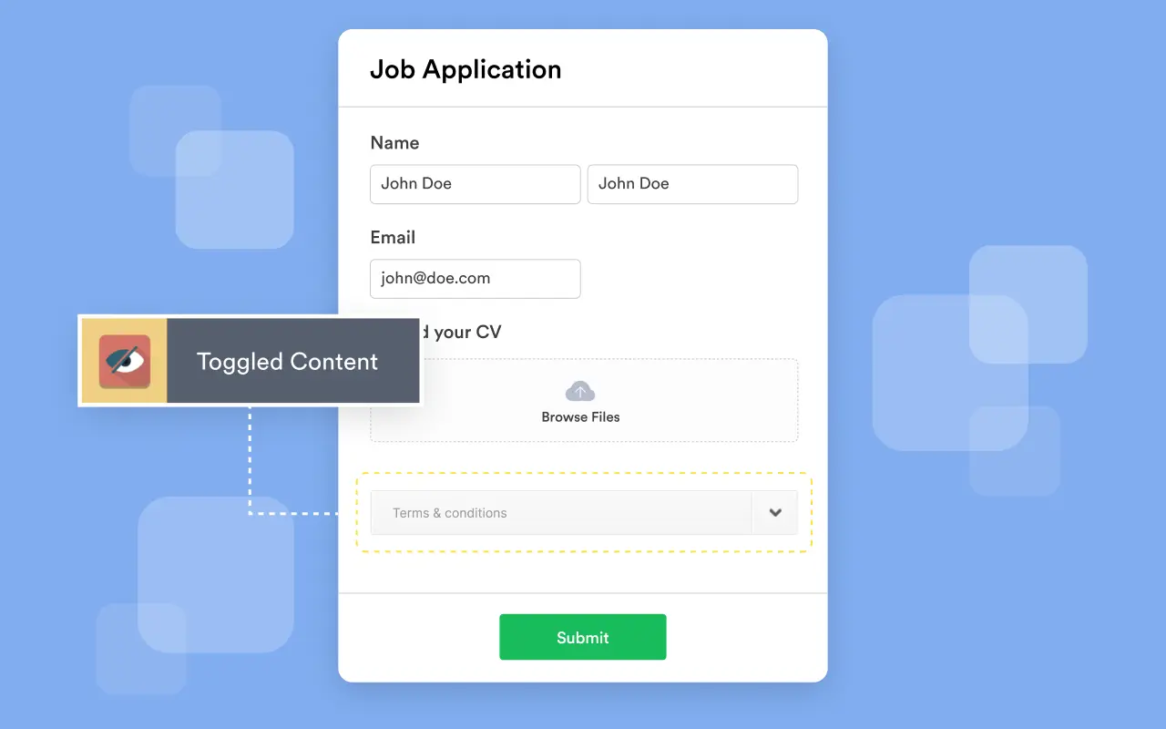 Use this free Toggled Content widget from Jotform to add non-editable content to your forms with no coding required. Show or hide toggled content for your users — great for content important instructions, terms and conditions, and more.